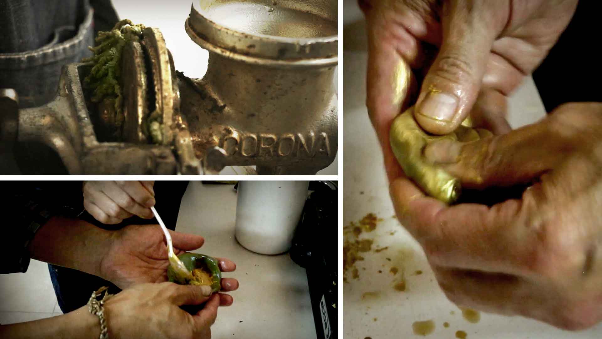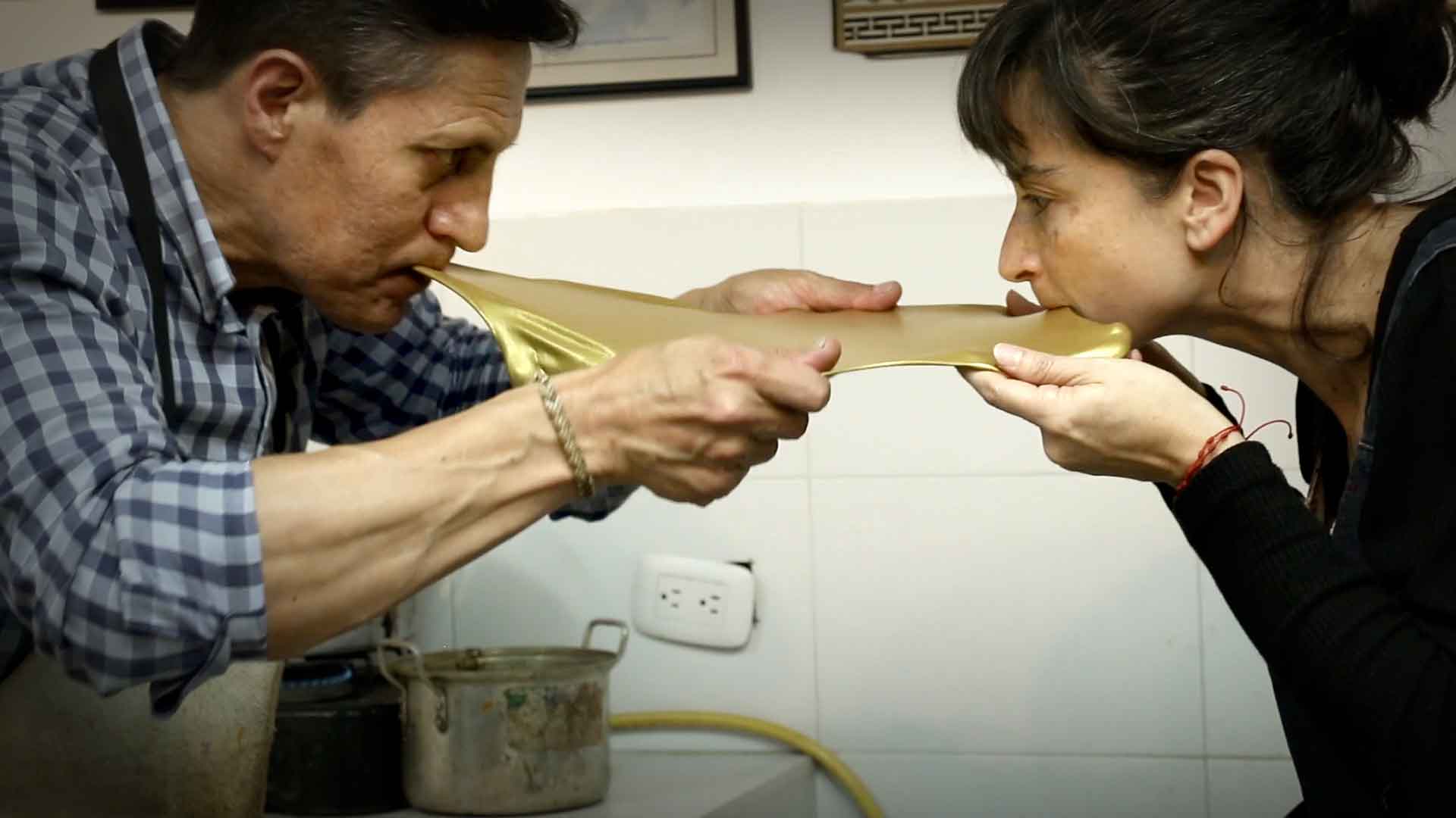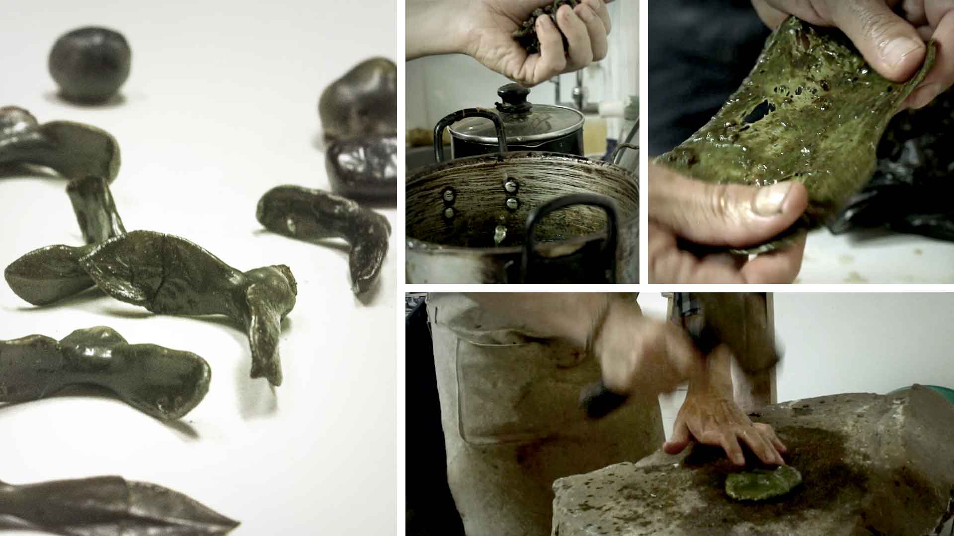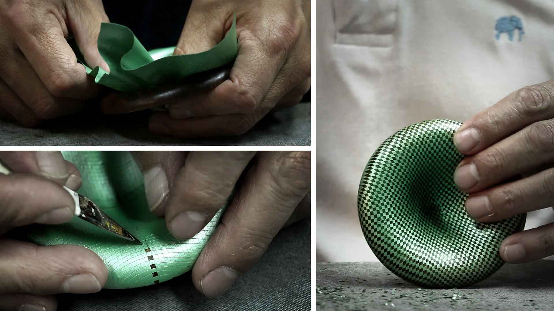 Die gefärbte und gestreckte Harzfolie wird nun auf aufwendig vorbehandelte und von der Designerin durchdachte Holzträger aufgebracht. Hierzu trägt der Kunsthandwerker kleine Stücke Mopa-Mopa-Folie auf, indem er sie mit den Händen auf das Holz presst. Durch die entstehende Wärme wird die Harzschicht weich und haftet an der Oberfläche. Anschließend schneidet er mit einem Skalpell oder einer Klinge die gewünschten Muster aus und legt so Bereiche frei, die in gleicher Weise mit Lack in anderen Farben verziert werden, bis die Dekoration vollständig ist.
