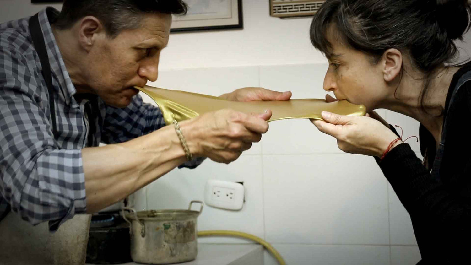 Auf diesem Bild siehst du wie Tatiana zusammen mit einem Kunsthandwerker durch synchronisierte Bewegungen von Händen und Mund eine dünne Mopa-Mopa-Folie formt.