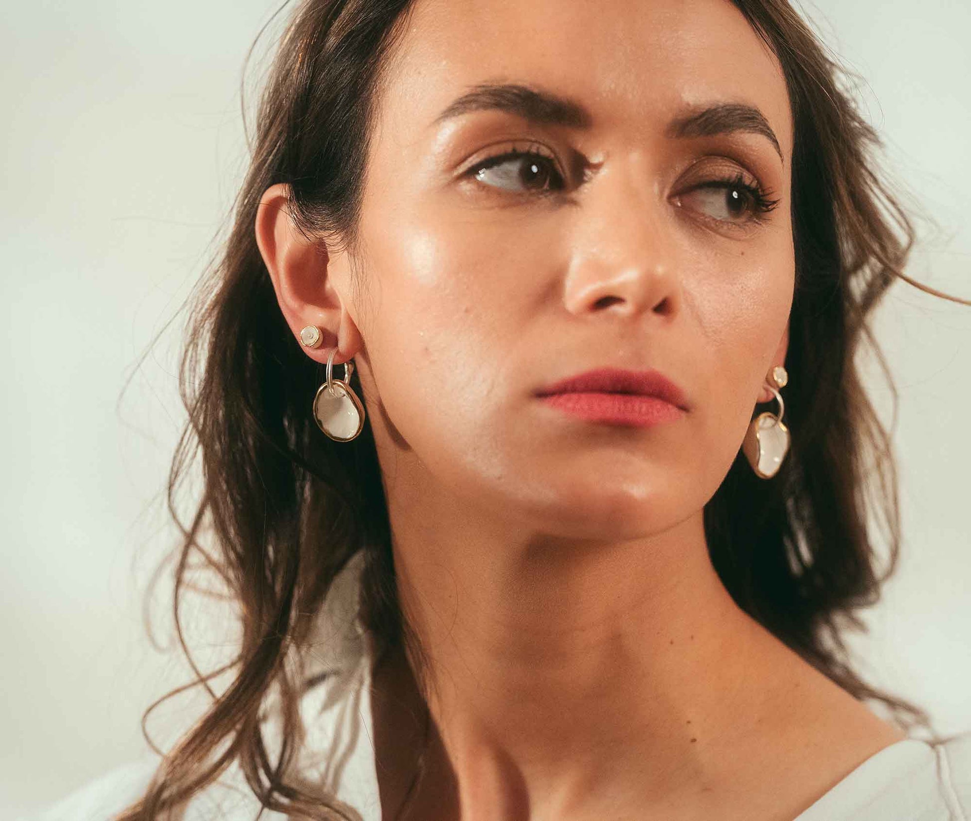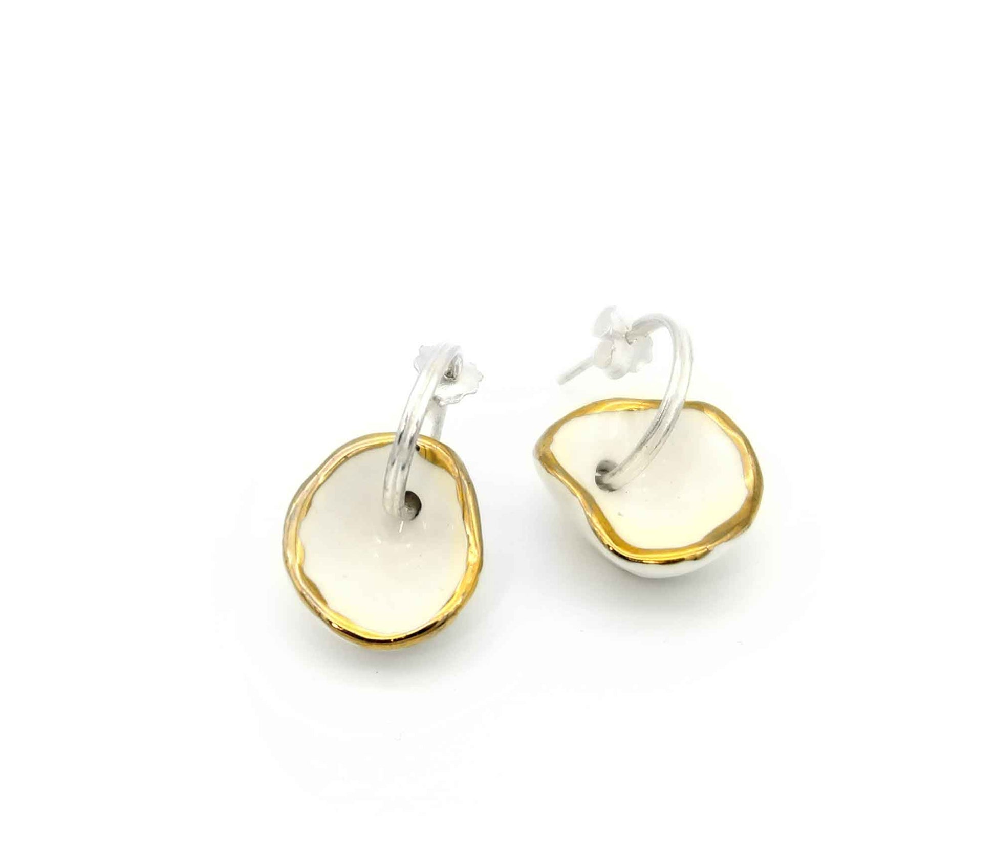Die Ohrringe wirken am Ohr zugleich leicht und ausdrucksstark. Das glasierte Porzellan entfaltet eine sanfte Helligkeit, während der unregelmäßige Rand jedem Stück seinen individuellen Charakter verleiht. Der vergoldete Abschluss fängt das Licht ein und setzt edle Akzente. Mit nur 3,3 Gramm Gewicht sind die Radiolarias Medianas angenehm zu tragen – fast schwerelos, aber stets präsent. Am Ohr zeigen sie sich als dezente, doch kraftvolle Begleiterinnen, die dein Gesicht sanft umrahmen und subtil strahlen lassen.