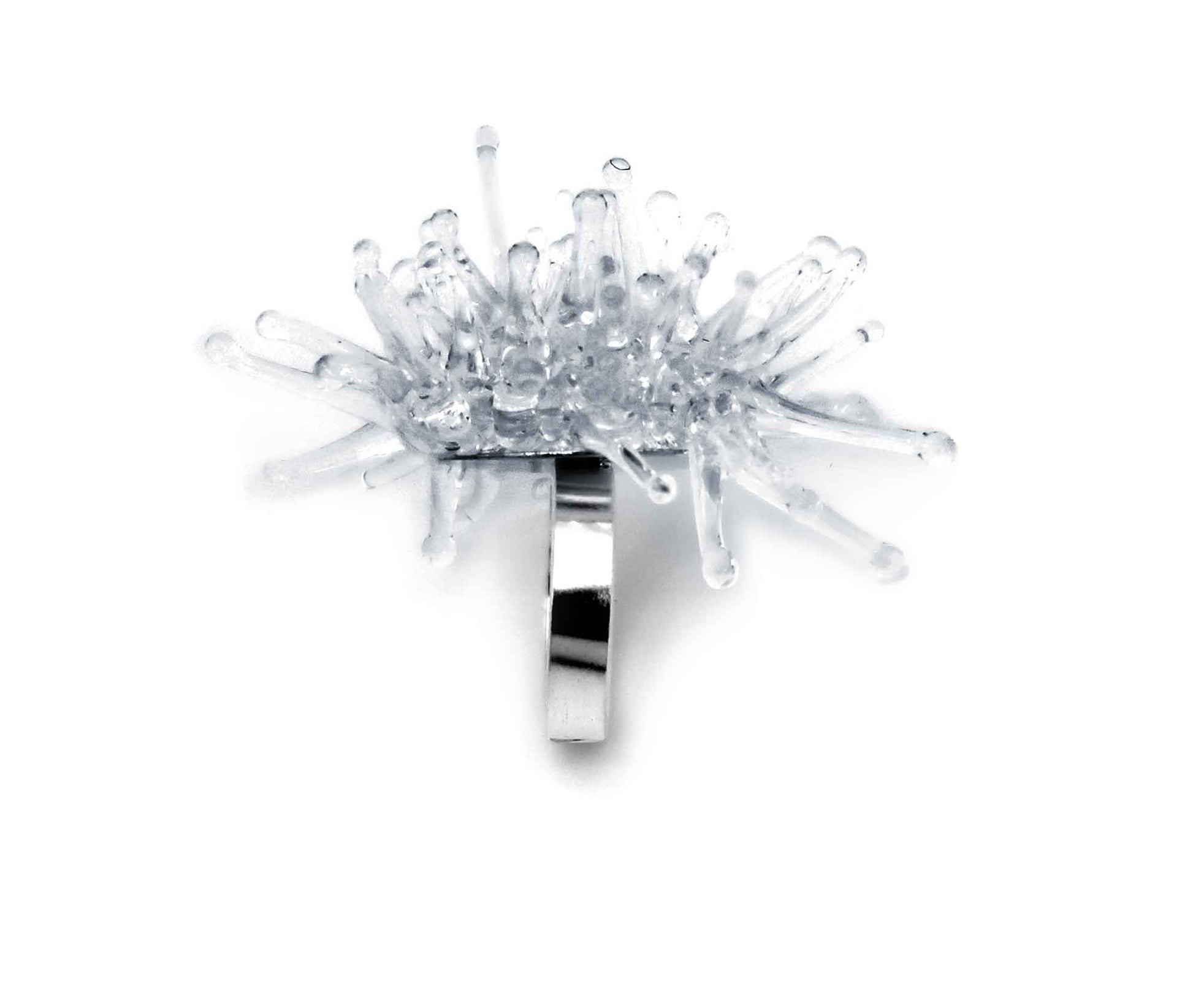 Der Ring kombiniert klare Geometrie mit organischer Dynamik. Die transluzenten Glaselemente changieren je nach Blickwinkel – wie schimmernde Tropfen, die sich im Raum verankern. Die silberne Basis ist handgefertigt, offen und leicht anpassbar. Auf der Hand getragen wird Eugenia zum Statement – ein Ausdruck von Haltung, Neugier und individueller Schönheit.