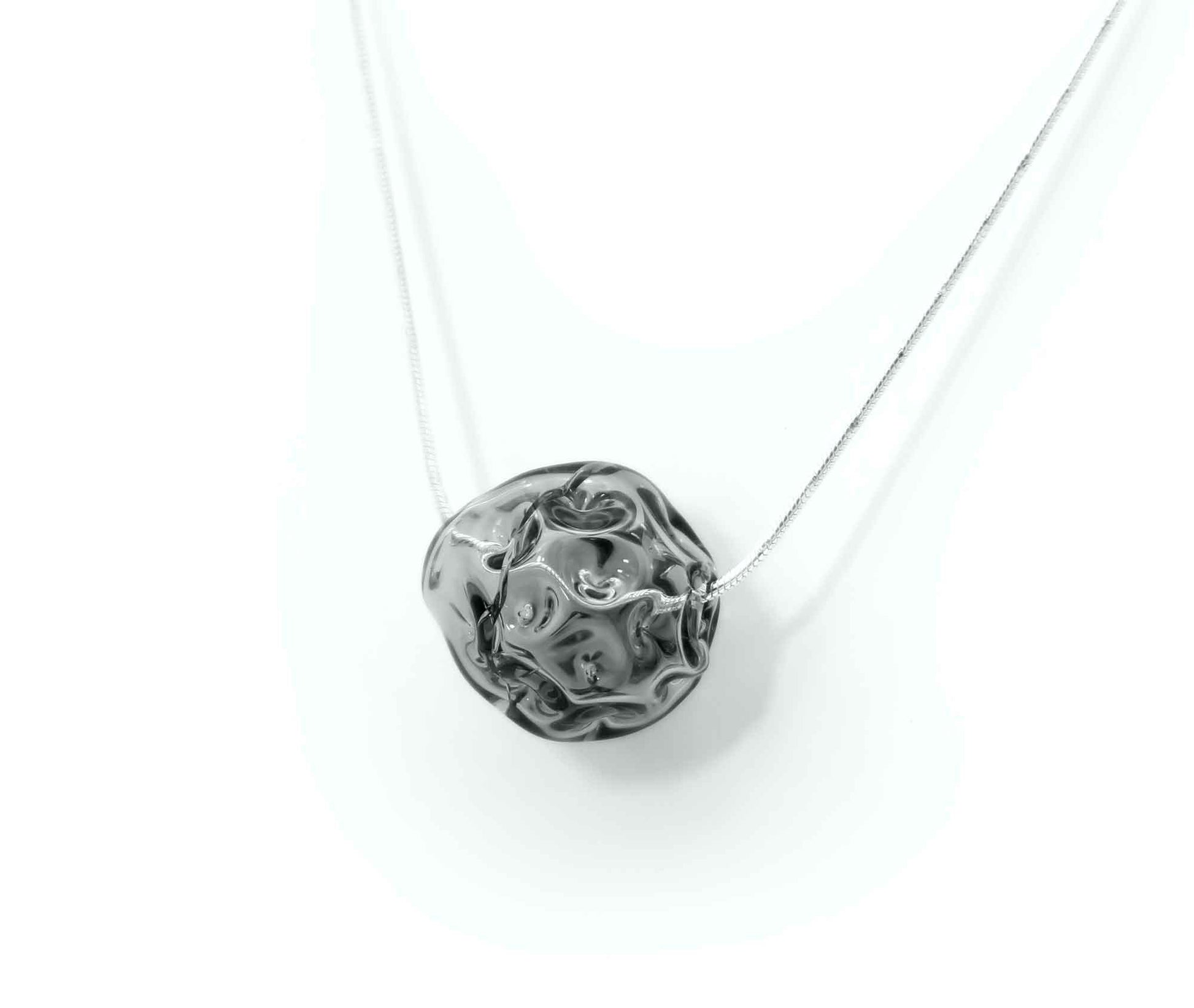 Die Glaskugel von etwa 2 cm Durchmesser wirkt wie eine schwebende Rauchwolke, eingefangen in einer transparenten Sphäre. Trotz der sanften Anmutung des Materials ist das Stück stabil und für den Alltag geeignet – Glas und Silber ergänzen sich perfekt. Die Kette legt sich sanft um den Hals, reflektiert das Licht subtil und schafft ein Gefühl von Klarheit und Eleganz.