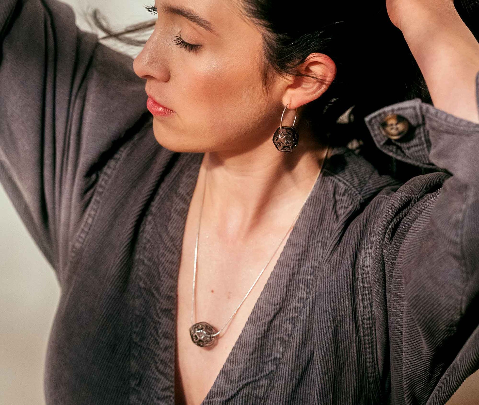Diese Ohrringe begleiten dich wie ein poetisches Detail – zart und doch ausdrucksstark. „Gris Humo“ erzählt von Glas, Licht und Identität und wird zu einem Teil deiner eigenen Geschichte.