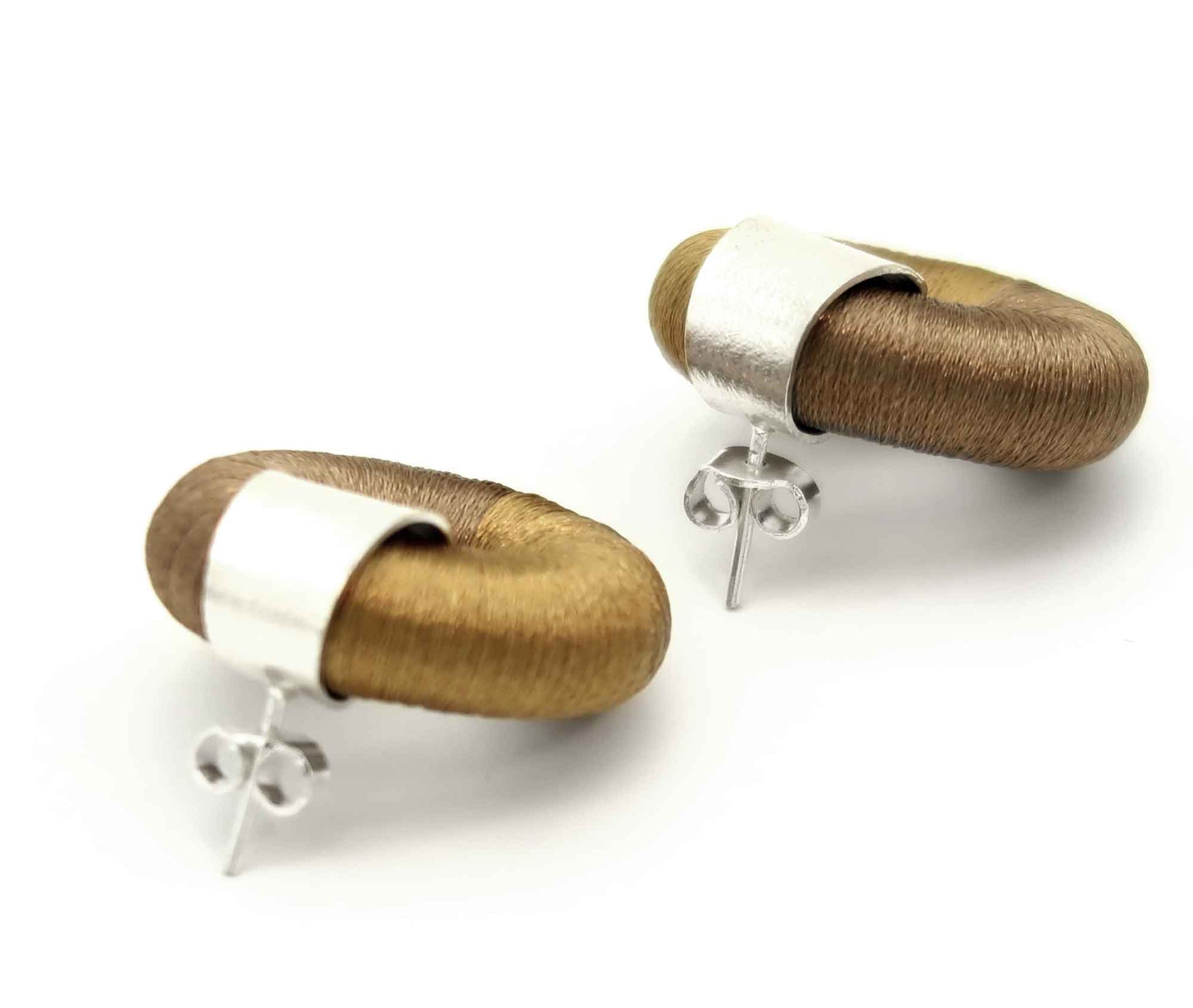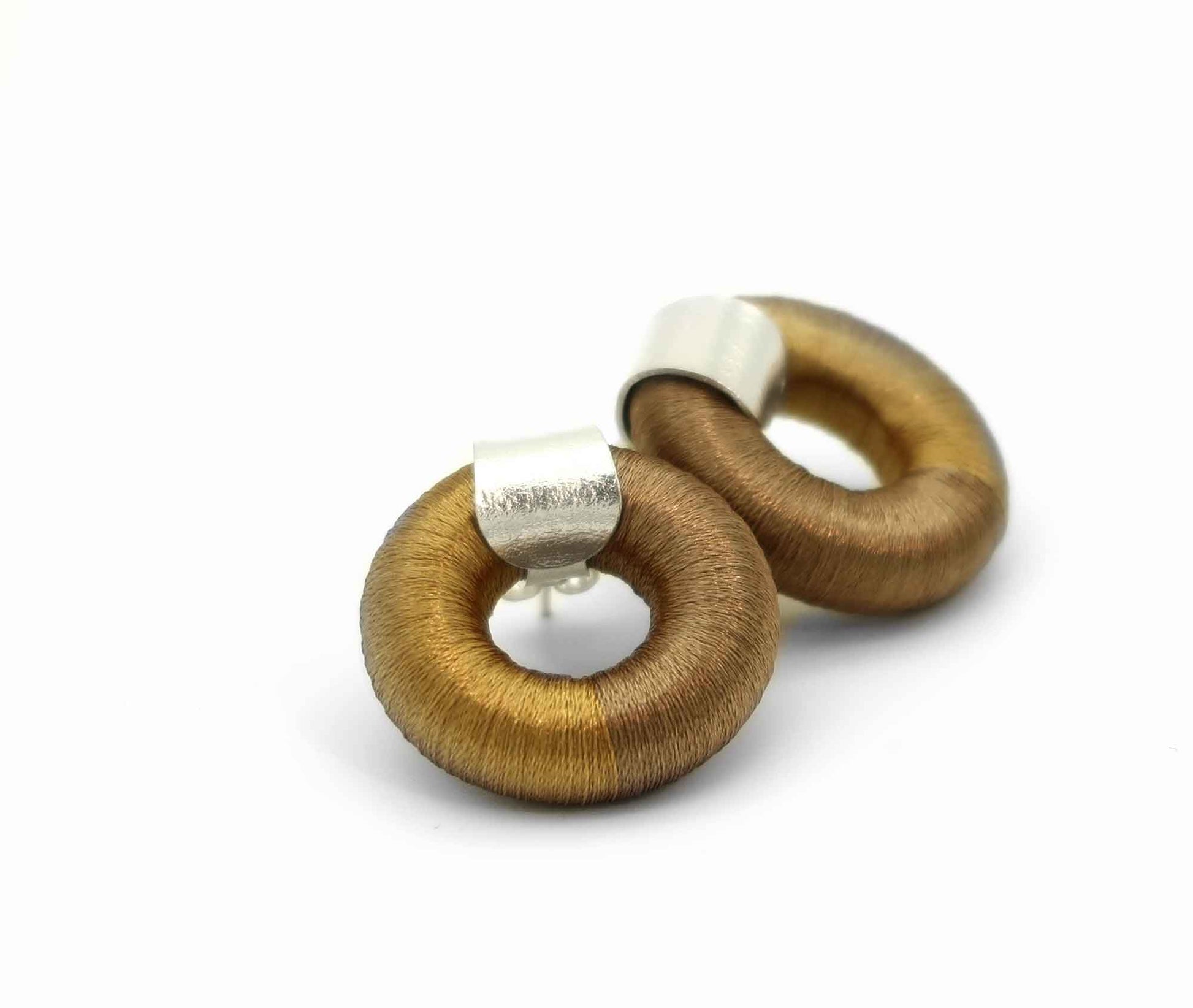 Das Silberelement ruht wie ein feiner Steg über dem runden Körper und fängt das Licht. Die handgefärbten Baumwollfäden zeigen ein warmes Braun-Gold-Spiel, das sich weich anfühlt und am Ohr eine ruhige, moderne Präsenz entfaltet. Mit nur ca. 4,5 g pro Ohrring sind sie angenehm leicht – ideal für lange Tage und späte Abende.